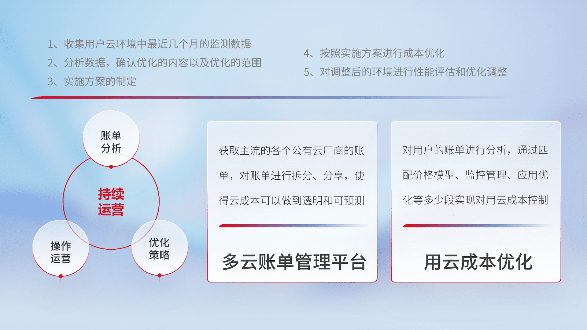 通过多云纳管,,,以统一的资源数据模型把客户的云资源进行抽象和封装,,,,进而实现对多云资源的统一操作,,,保障云资源管理的可靠性、、、、稳定性与可用性。。量身定制化运维内容,,,配置、、、开发运维、、、、补丁管理、、、、备份、、、监控、、、认证和访问管理、、审计和日常巡检等,,,保障在用云过程中的可靠度,,稳定度以及高可用率。。