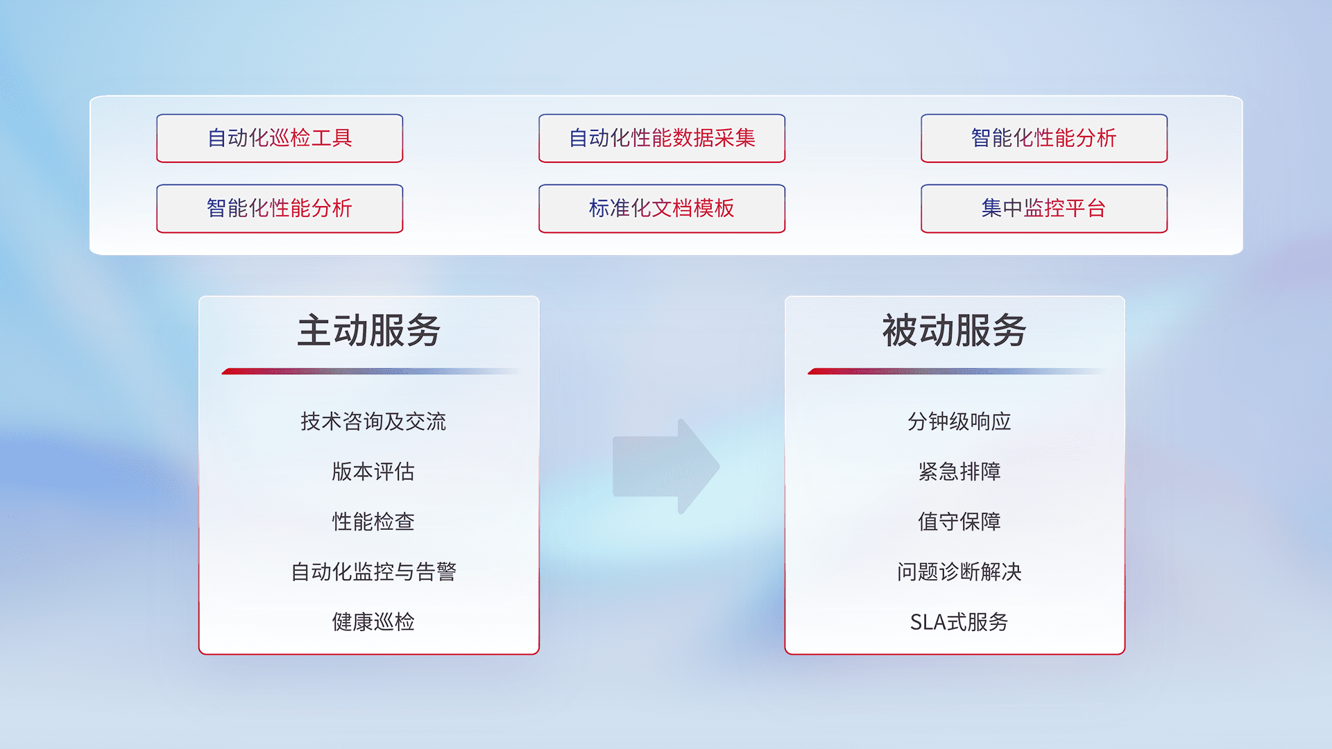 智能化工具和标准化文档,,保障服务质量,,提供主动服务(包含技术咨询、、、、版本评估、、、、性能检查、、自动化监控与告警、、、健康巡检)和被动服务包含(分钟级响应、、紧急排障、、、、值守保障、、、问题诊断解决、、SLA服务)。。。。